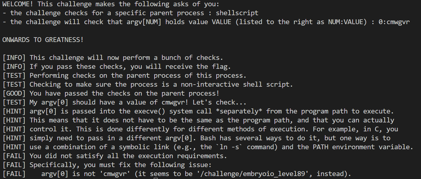 这里最开始一直在想怎么传KEY:VALUE这类型的参数,后面又重新看了n遍题目反应过来是要argv[num]=value,然后想到第三题直接/challenge/embryoio_level3 arguments,于是修改my_script.sh中的命令就好了 (这里能这么传是因为num=1,详见68 )