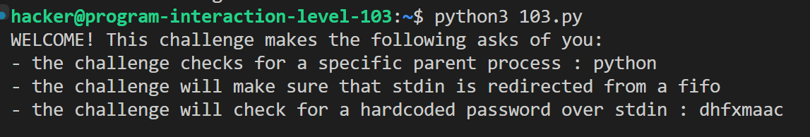 1 2 3 4 5 6 7 from pwn import *pipe_fd = os.open ("/home/hacker/in" , os.O_RDWR) os.dup2(pipe_fd, 0 ) subprocess.run(["/challenge/embryoio_level103" ])