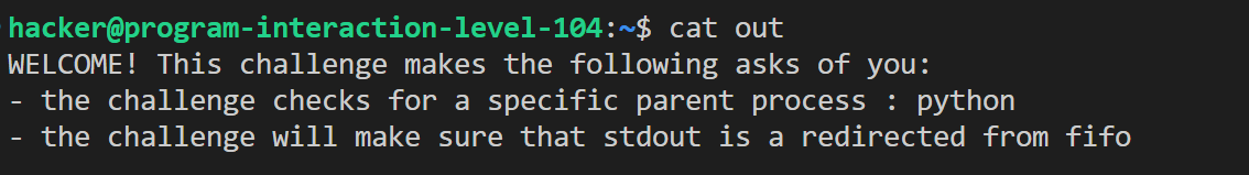 1 2 3 4 from pwn import *pipe_fd = os.open ("/home/hacker/out" ,os.O_RDWR) os.dup2(pipd_fd,1 ) subprocess.run(["/challenge/embryoio_level104" ])
