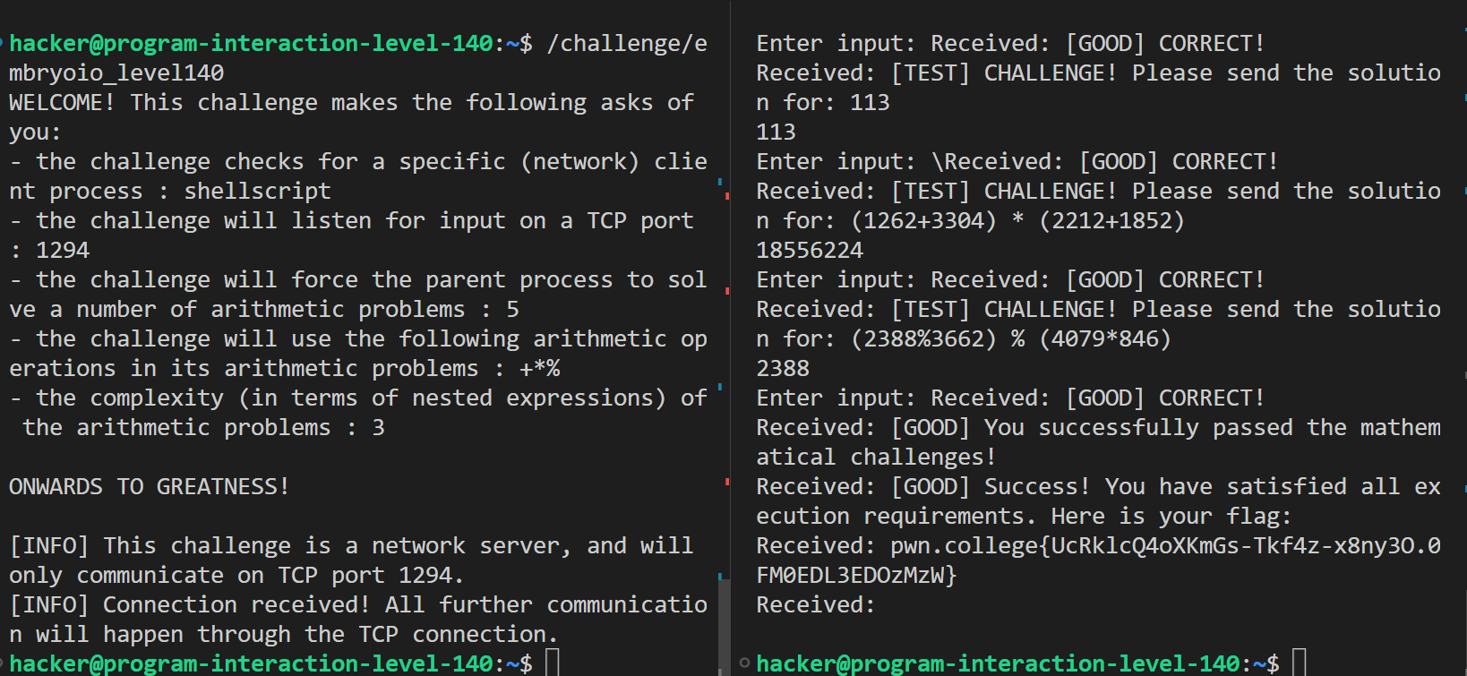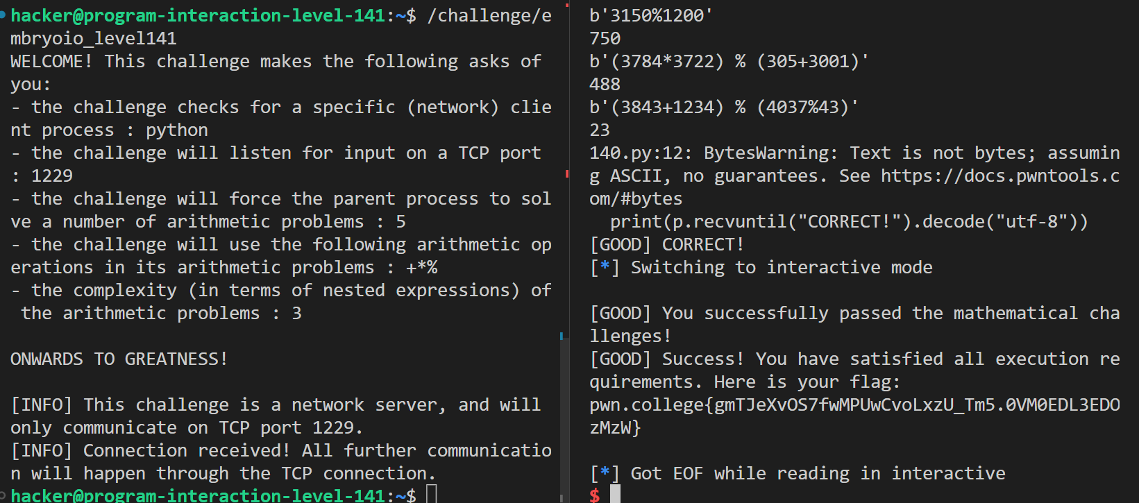 下面是全部逻辑都在一个脚本中方法: 1 2 3 4 5 6 7 8 9 10 11 12 13 14 15 16 17 18 19 20 21 22 23 24 25 26 27 28 29 30 31 32 33 34 35 36 37 38 39 40 41 from pwn import *import multiprocessingimport subprocessimport time k = process(["/challenge/embryoio_level141" ]) challenge_process = multiprocessing.Process(target=process, args=("/challenge/embryoio_level141" ,)) k.wait() challenge_process.start() time.sleep(2 ) p = remote("localhost" , 1229 ) for i in range (5 ): output = p.recvuntil(b"CHALLENGE! Please send the solution for: " ) expression = p.recvuntil(b"\n" ).strip().decode() print (expression) result = eval (expression) print (result) p.sendline(str (result)) final_output = p.recv().decode() print (final_output)p.interactive()