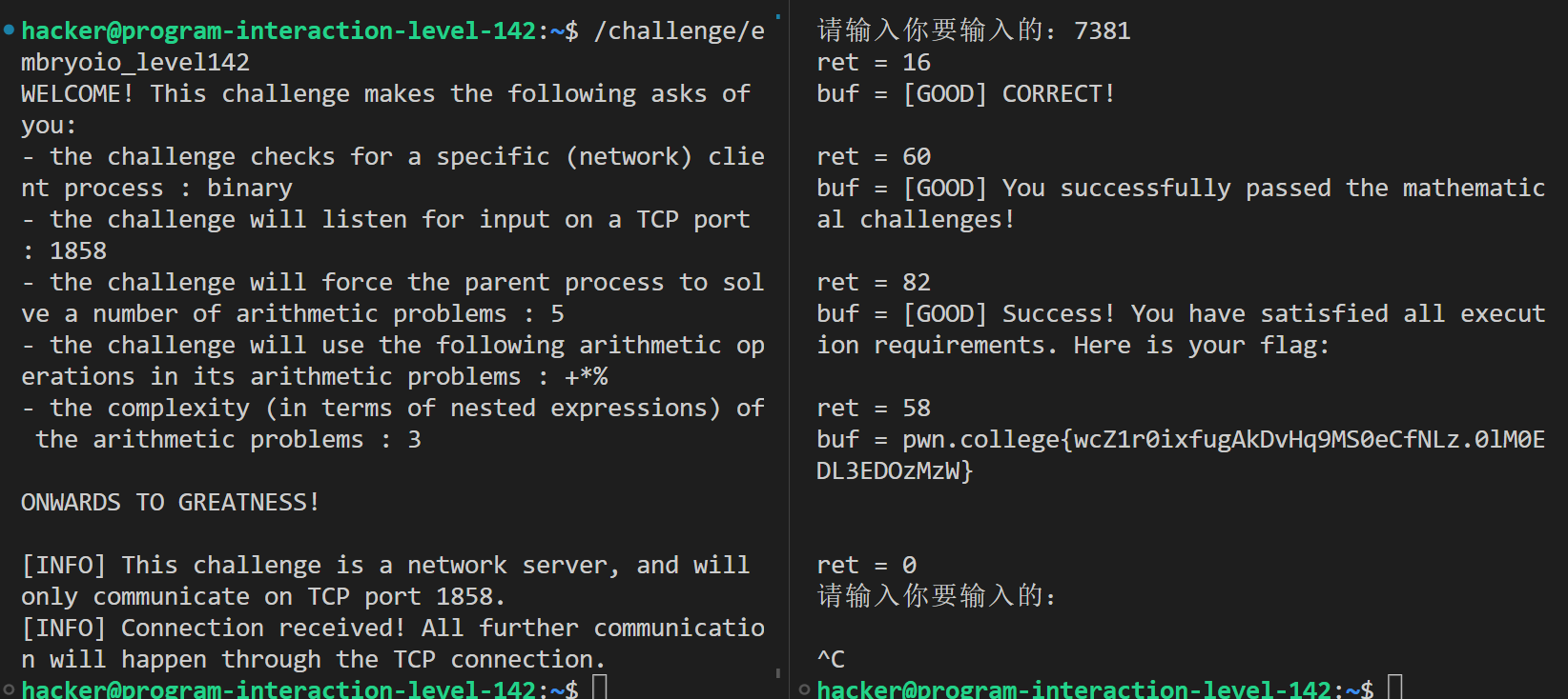 这份代码里的三种方法其实思路都差不多,把运行/challenge/embryoio_level141也写进代码中,但是需要注意不能直接process(["/challenge/embryoio_level141"]),这样因为后续没有对这个进程进行操作,所以它会直接结束,在后面加interactive()也不行,因此要以子进程的形式去运行,challenge_process = subprocess.Popen(["/challenge/embryoio_level141"])这个可以运行也表示了这个挑战并不是和以前一样要求在python中运行/challenge,而是要在要求的语言中去获取端口中的输出信息并进行处理